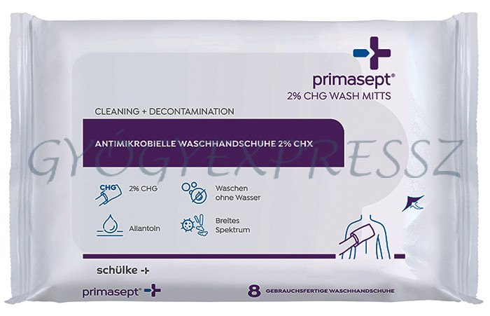 Schülke primasept 2% CHG mosdókesztyűk alkalmasak műtét előtti betegelőkészítésre, valamint víz nélküli teljes testtisztításra.