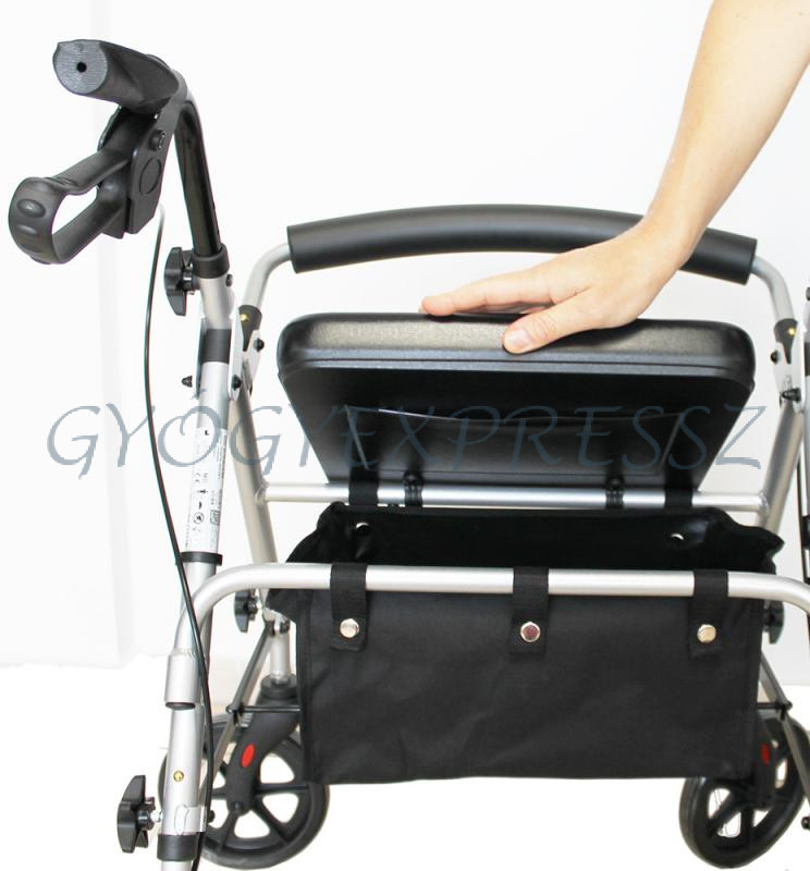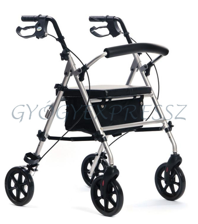 Összecsukható, négykerekű alumínium rollátor, két fix, fékezhető hátsó kerékkel, és két forgó első kerékkel.
