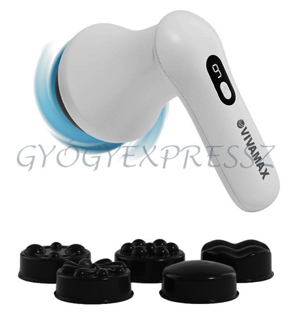 Ergonomikus, könnyen kezelhető vibrációs masszázskészülék 9 intenzitásfokozattal és 5 cserélhető fejjel.